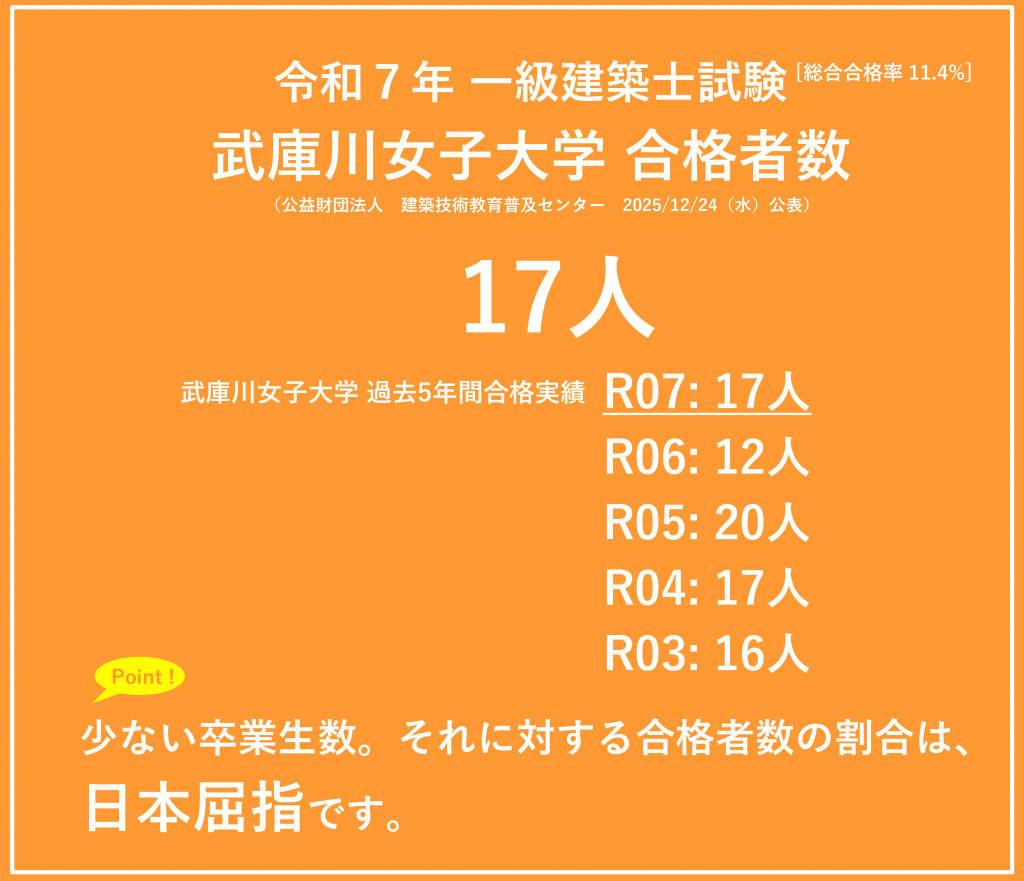 令和7年12月24日(水)に一級建築士の合格発表がありました。本学は17人が合格しました。女子大の中では日本一の人数です。しかも少人数制の教育を行っているため、少ない卒業生数の中、多くの割合の卒業生が夢をかなえています。