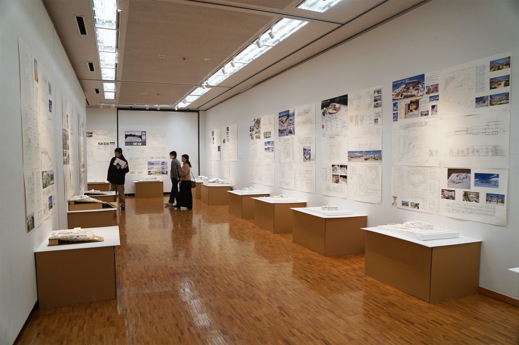 3階展示室前には建築学専攻と景観建築学専攻2年生の修士設計作品も展示されています