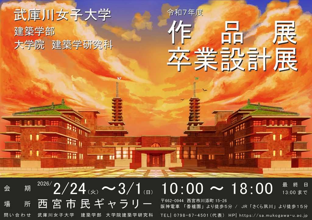 2026年2月24日(火) ~ 3月1日(日)の6日間、西宮市立市民ギャラリーにおいて建築・景観建築 両学科の1年生から大学院修士2年生までの有志の学生たちが、演習時間に制作した空間造形作品、建築やランドスケープの設計作品、卒業設計・修士設計作品、共同制作した原寸大の茶室など、約130点を出展しました。多くの方々にご来場いただき、誠にありがとうございました。