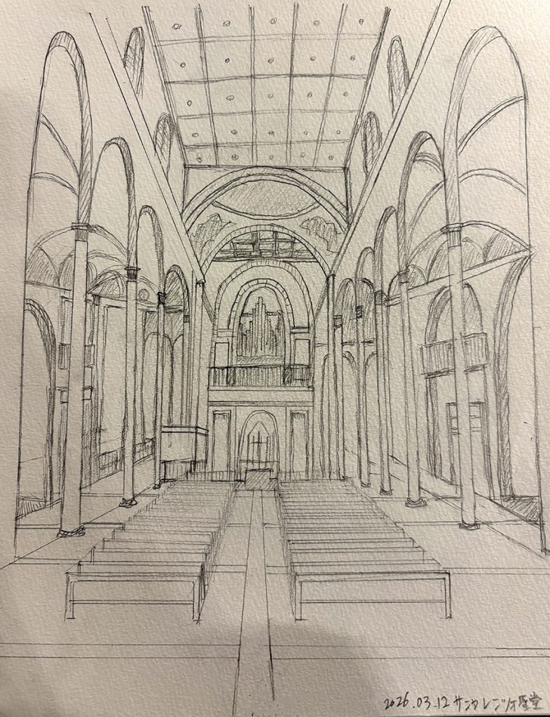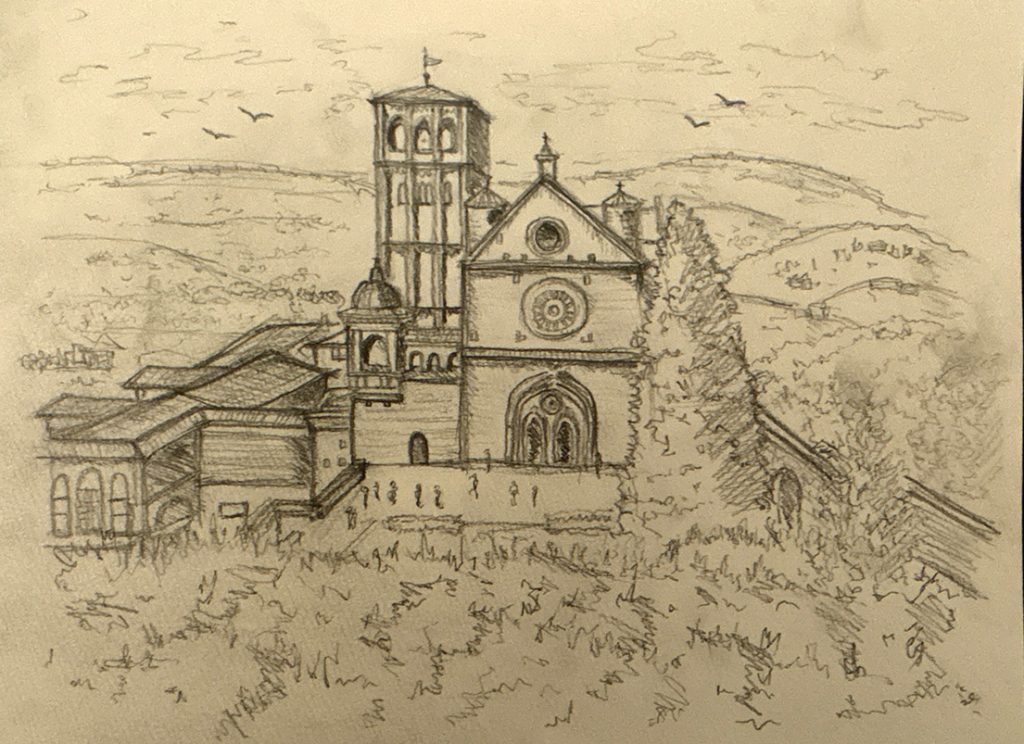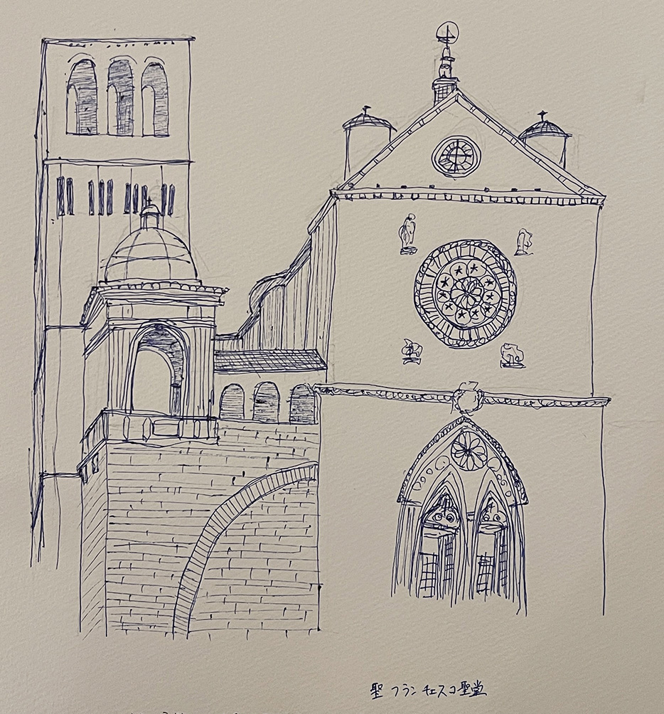 バニャイアではユニークな彫刻のあるサクロポスコを見学し、スケッチしました。アッシジでは、サン・フランチェスコ聖堂、サンタ・マリア・ソプラミネルヴィ聖堂、サンタ・キアーラ聖堂を見学、スケッチしました。