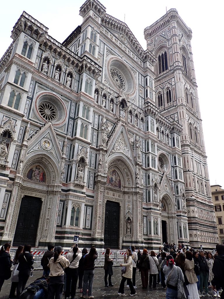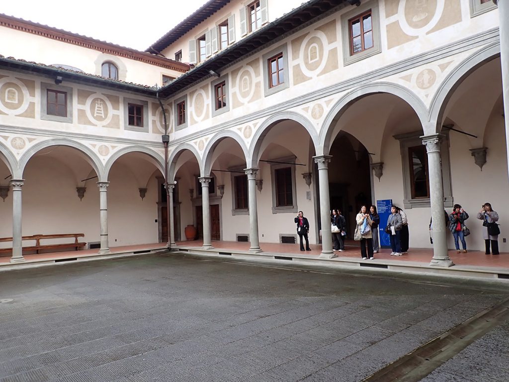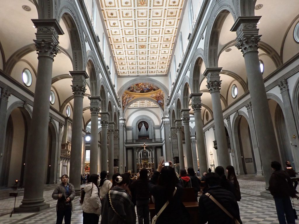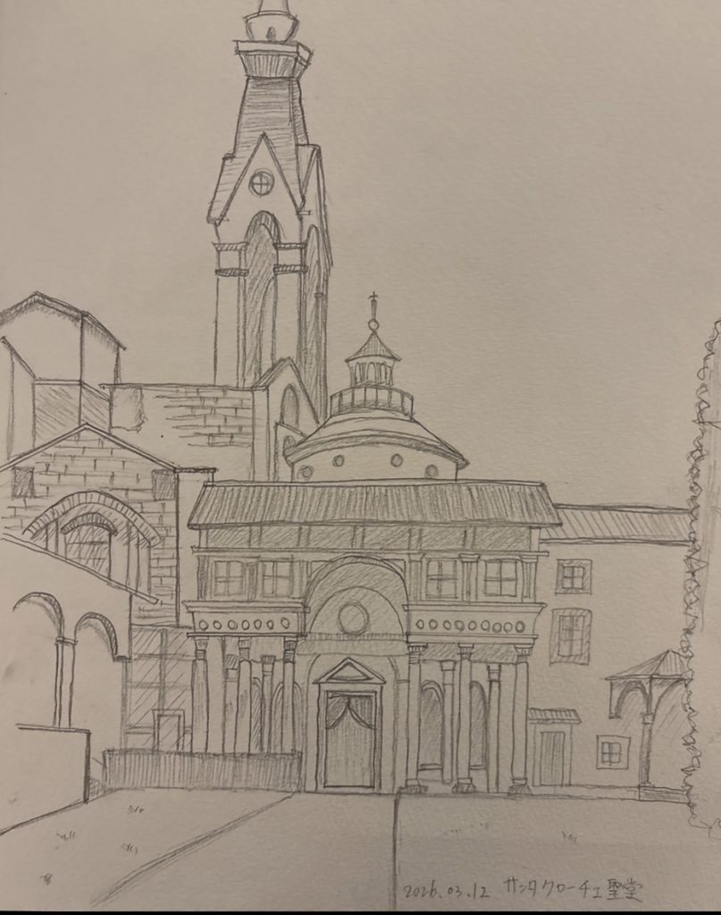 フィレンツェでは、サン・ロレンツォ聖堂、オスペダーレ・デッリ・インノチェンティ、メディチ・リッカルディ宮殿、サンタ・マリア・デル・フィオーレ大聖堂、サンタ・クローチェ聖堂、バッツィ家礼拝堂、ウフィツィ宮殿中庭、ポンテ・ベッキオ、ピッティ宮殿、サント・スピリト聖堂、サンタ・マリア・ノヴェッラ教会などを見学、スケッチしました。夕食をとり、フィレンツェ サンタ・マリア・ノヴェッラ駅からローマにもどりました。