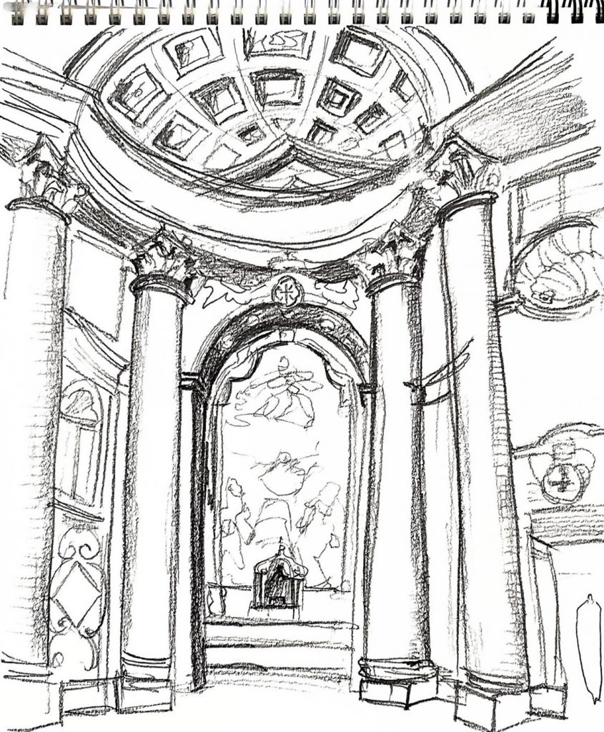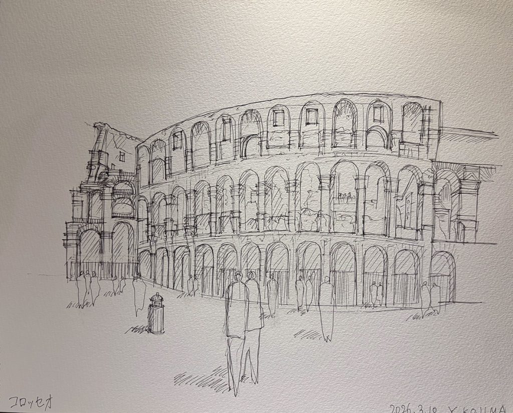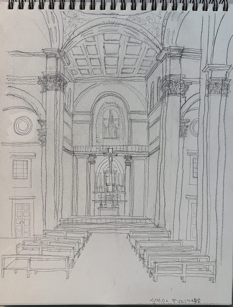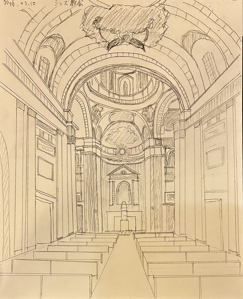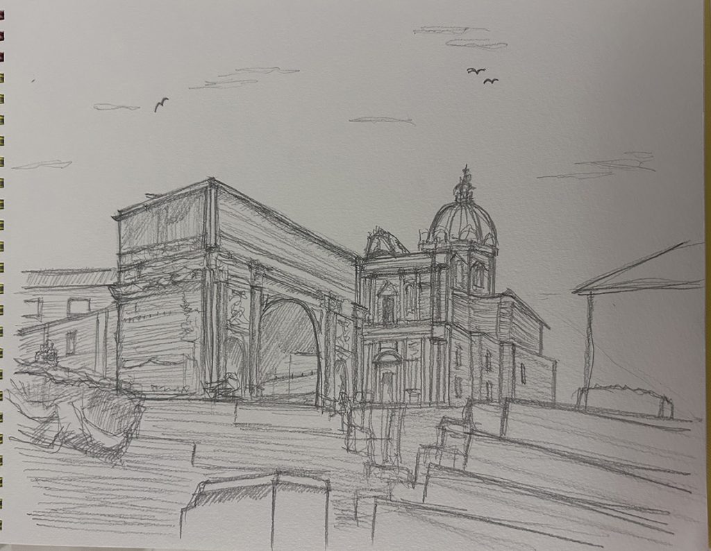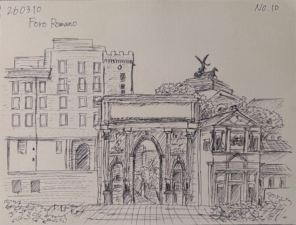 コロッセオ、フェロロマーノなどのローマ時代の遺跡、ジェズ協会、カンピドリオ広場、ヴェネチア宮殿、サンタンドレア・アル・クイリナーレ教会などを見学、スケッチしました。