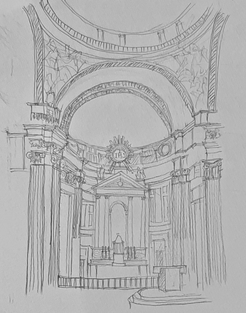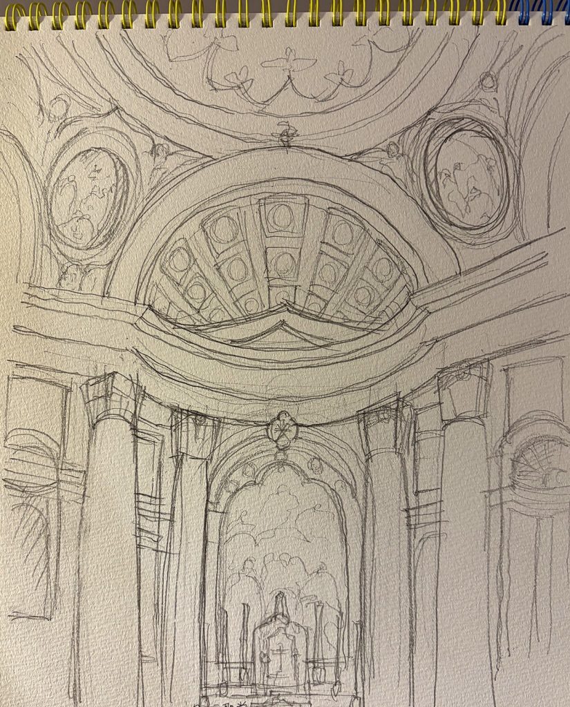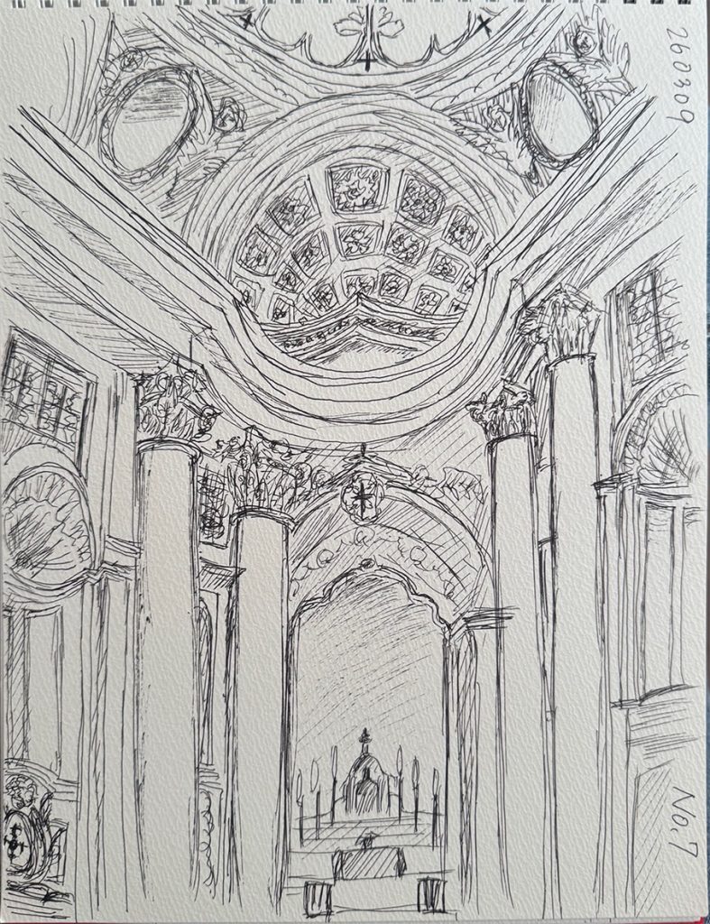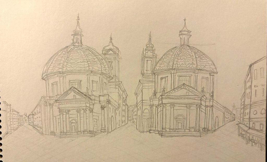 ディオクレティアヌス浴場跡、サンタ・マリア・デランジェリ・エ・デイ・マルティーリ聖堂、サンタ・マリア・デッラ・ヴィットーリア聖堂、サンタ・マリア・マッジョーレ聖堂、サン・カルロ・アッレ・クアトロ・フォンターネ聖堂、パラッツォ・バルベリーニ、スペイン広場、ヴィラ・メディチ、ポポロ広場、サンタコスタンザ教会などを見学、スケッチしました。